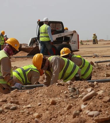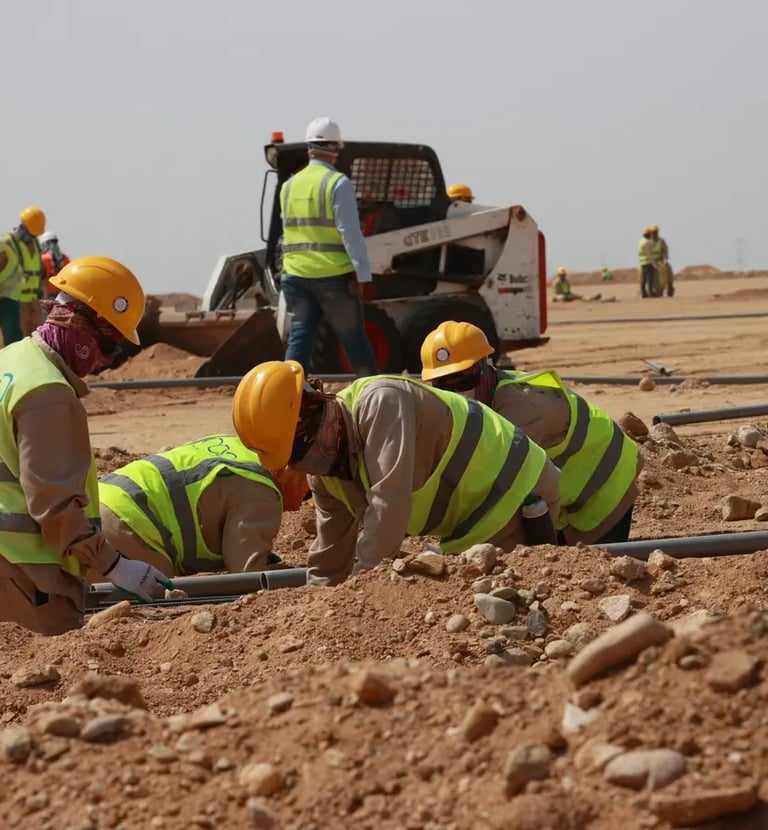 مجموعة كبيرة من المهندسين والعمال والمشغلين المتدربين على إتمام عمل الحفر